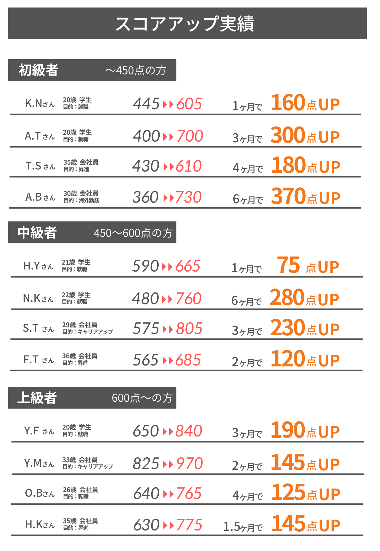 | TOEIC®テストに役立つ解答技術に基づいた実践練習、ミス分析、改善点を克服するための訓練、 語彙や文法といった英語力そのものの講義、正しく学習を進められているかどうか等、スコアアップに向けて皆様の学習LIFEを全面的にサポート致します! | TOEIC®初心者でも短期間で実力アップが図れるよう、個々にカスタマイズした指導を行います。対話の中で生徒の特長を早期に見 極め、弱点を克服しつつ長所を最大限引き出します。リーディングでは文法の基礎固めと読解力アップの方法を、 リスニングでは聴き取りを飛躍的に向上させるポイントを具体的に解説しながら実践練習を行うことで、短期間で のスコアアップを実現します。 | TOEIC®の目標達成には抜け道や近道は無いと考えています。日々コツコツと学習をする意思と覚悟が何よりも大事と言う事を生徒さんから教わってきました。適した学習法や長所・短所は人によって異なりますの でそのガイド役を精一杯務めさせていただきます。 | TOEIC®のスコアが伸び悩む人は、勉強の方法が間違っている人が多いです。大切なのは、自分の弱点を見極め、それを効率的に解決していくためのカスタマイズされた学習です。それさえできれば誰でもスコアは伸びますが、一人では難しいのが現実です。徹底的にサポートしますので、一緒にスコアアップを目指しましょう。 |